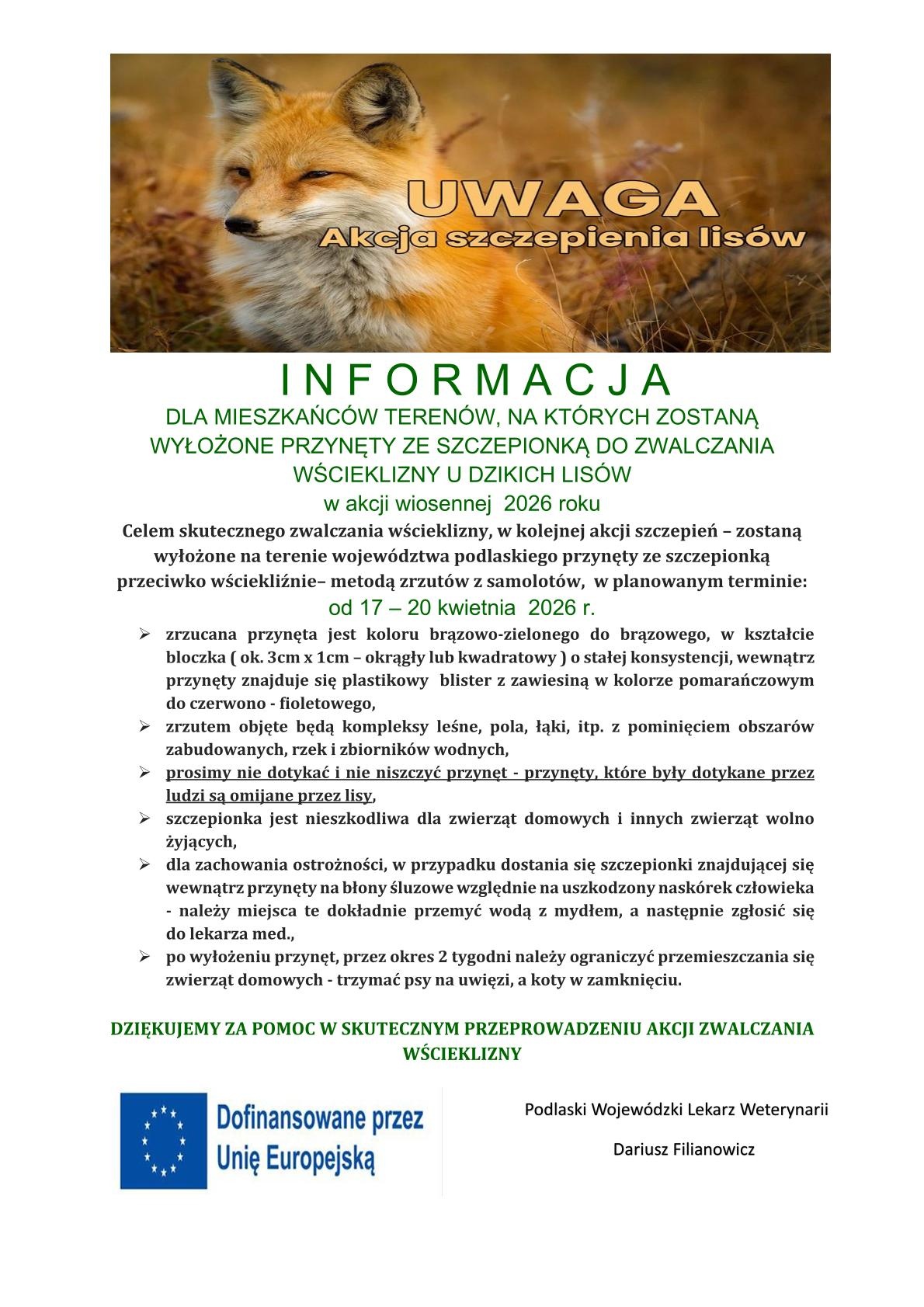INFORMACJA DLA MIESZKAŃCÓW TERENÓW, NA KTÓRYCH ZOSTANĄ WYŁOŻONE PRZYNĘTY ZE SZCZEPIONKĄ DO ZWALCZANIA WŚCIEKLIZNY U DZIKICH LISÓW