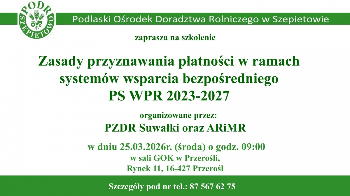 Zapraszamy na szkolenie "Zasady przyznawania płatności w ramach systemów wsparcia bezpośredniego PS WPR 2023-2027" organizowanego przez PZDR Suwałki oraz ARiMR, które odbędzie się w dniu 25.03.2026r. środa) o godz. 09:00 w sali GOK w Przerośli, ul. Rynek 11, 16-427 Przerośl. Szczegóły pod nr tel. 87 567 62 75
